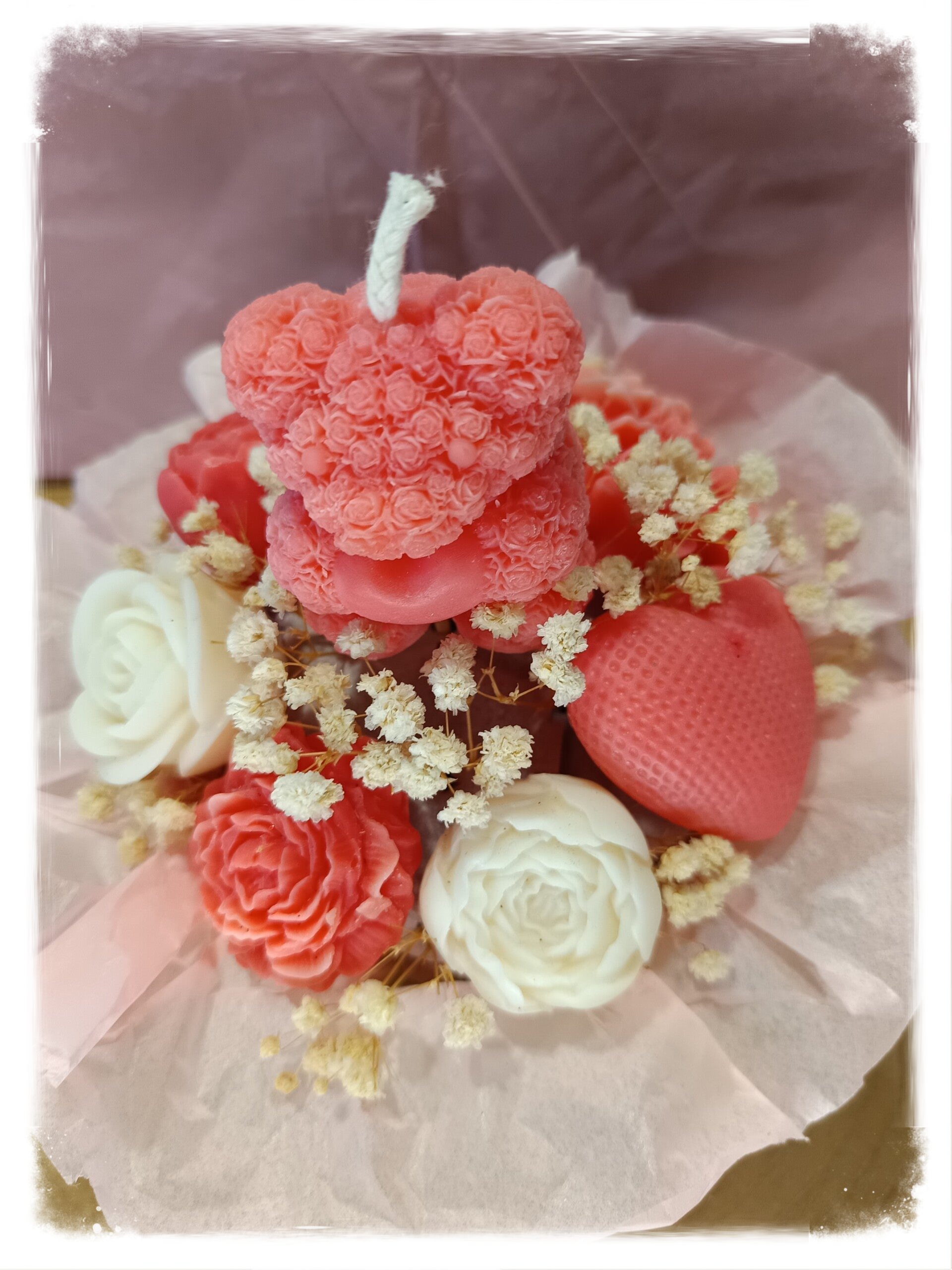 Ce bouquet est composé de fondants parfumés et d'une bougie.